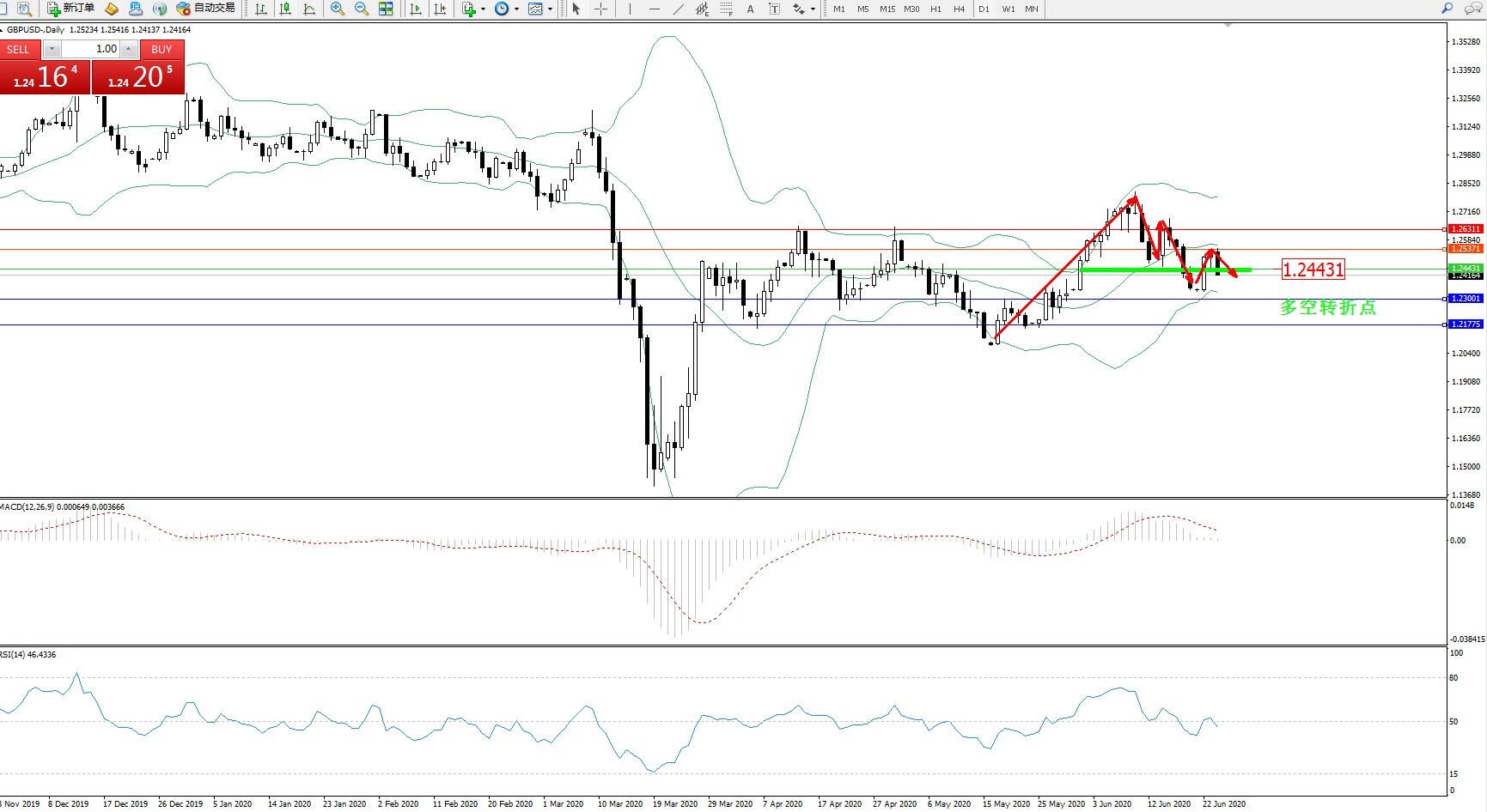 交易策略:1.24431下方看跌,目标1.23001、1.21775
