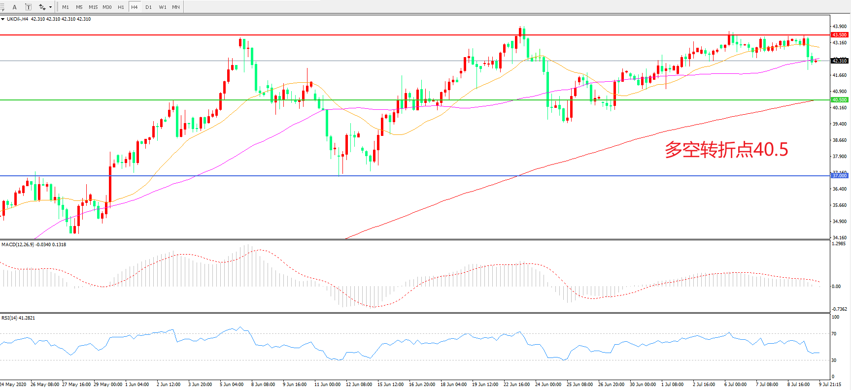 周三(7月8日),美国新冠确诊人数单日突破6万引发市场恐慌,风险资产遭到抛售,布伦特原油大幅下挫,收报42.31美元/桶。在OPEC及其盟友7月15日召开市场监督小组会议之前,市场更多时候会处于多空拉锯状态,短线出现暴跌的概率不大。目前的回调可能有利于空头积攒人气,但也有利于多头修复过高的指标,因此在行情没有出现明显的趋势之前,依旧当作震荡处理。
