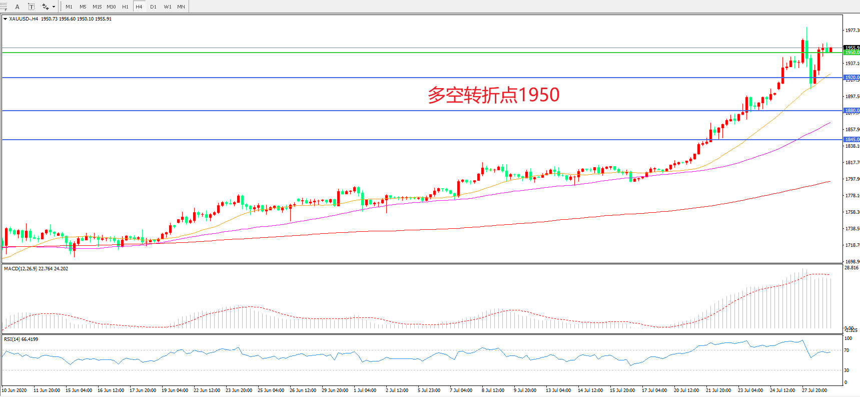 周二(7月28日),黄金走势可谓跌宕起伏,亚市盘中,金价高歌猛进,最高触及1980美元/盎司,11时左右,金银价格集体跳水,最低回撤至1906美元/盎司,70美元的“过山车”让投资者感慨今年果然是见证历史的一年,不过之后金价又重新企稳反弹,收报1950美元/盎司。