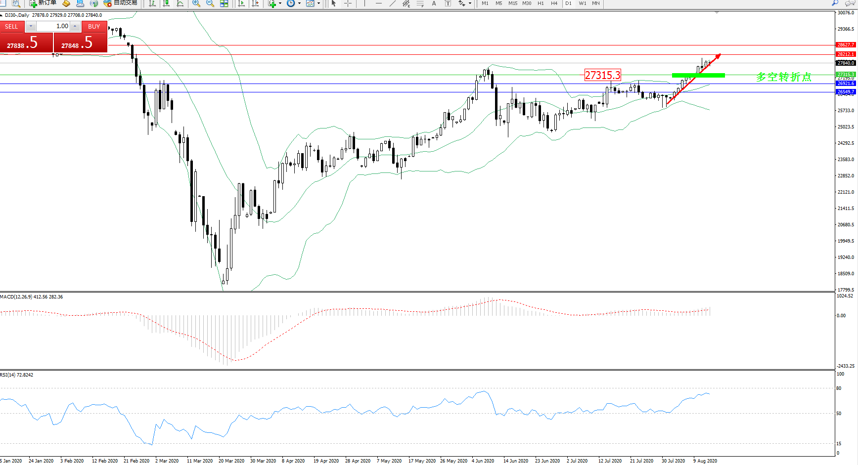 技术点评:多头动力延续布林带指标上轨附近持续震荡上扬走势良好,前期高位破位后有继续拉升态势,上行态势良好,且位有止步迹象,布林带指标呈张口走势中,且有扩大波幅迹象,MACD指标长时间处于0轴线上方维持窄幅弱势整理平移中,RSI指标处于多头区域持续整理向上移动态势良好;