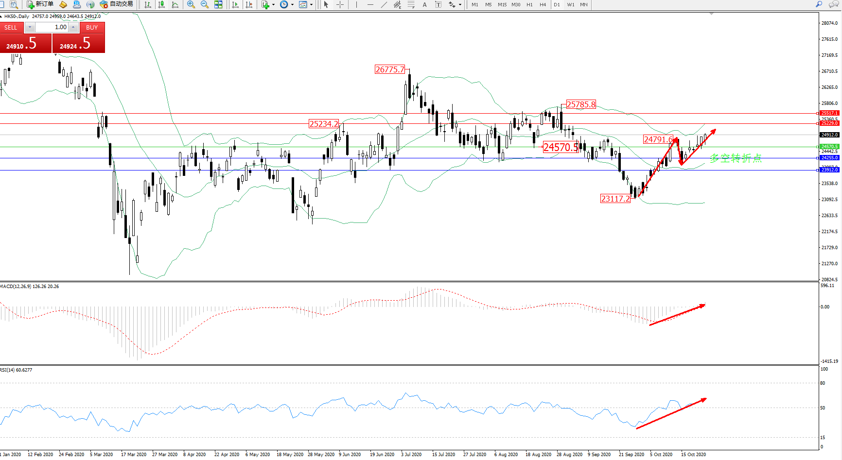 香港恒生指数10月23日(周五)收盘上涨132.65点,涨幅0.54%,报24918.78点;香港恒生指数今日并未受到A股下挫影响,周K线强势四连阳。科技股全线走低,致恒生科技指数大跌1.78%。和谐汽车升超7%再创新高;航空股、保险股、银行股相对活跃,有力支撑大市走强;前期强势的科技股全线回落,大型科技股全部走低,京东、小米、美团均跌超2%;在线教育股连跌多日,新东方在线大跌超8%创逾6个月新低价;体育用品股、医药股、手游股跌幅明显。今日南下资金净流入42.03亿港元,大市成交额为1116.4亿港元。恒指目前已经呈现盈利下调,估值被动逆向上调的情况,说明估值已经见底。疫情带来的盈利负面影响主要反映在中期业绩,盈利预期大幅下调的空间也不大。恒指成份股仍以传统行业蓝筹公司为主,而恰好该等公司在目前疫情期间估值处于显著低位,待世界疫情得到有效控制,传统行业公司业绩得到回升,估值将得到修复。