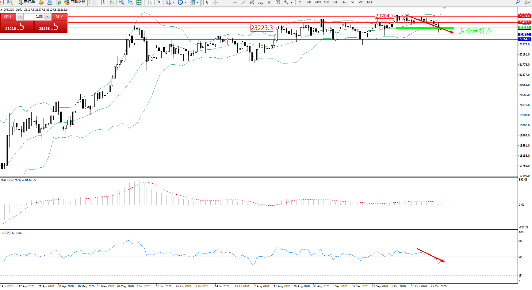 日经225指数10月29日(周四)收盘下跌112.01点,跌幅0.48%,报23306.50点。日本央行决定维持政策不变,反映出随着生产和出口改善,日本经济从创纪录的收缩中持续出现复苏迹象,不过日本央行再次表示,如果需要,准备采取进一步行动。资产购买的增加帮助保持了市场相对稳定,而约1万亿美元的贷款计划确保了陷入困境的企业能够获得信贷,而不是走向破产。日本政府和执政党人士透露,日本首相菅义伟定于下周宣布新一轮应对新冠疫情经济冲击的刺激计划。路透社28日以4名上述人士为消息源报道,日本政府先前划拨的10万亿日元(约合6400亿元人民币)紧急抗疫资金剩余7万亿日元,这7万亿日元将构成新刺激计划的大部分资金,其余资金将是新开支。路透社报道,日本执政党自由民主党一些议员先前呼吁出台总额10万亿日元的新刺激计划。消息人士说,新刺激计划可能延续对企业的补贴,以帮助企业缓解资金压力、避免裁员;还可能继续为国内旅游提供折扣直至明年1月,以促进国内游、帮助旅游业渡过难关。