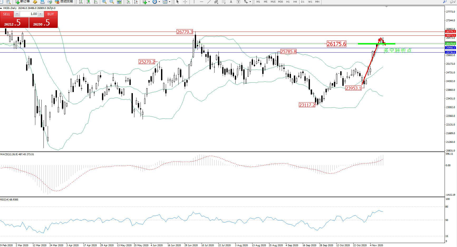 香港恒生指数11月12日(周四)收盘下跌57.6点,跌幅0.22%,报26169.38点;港股恒指收跌,科技股反弹,恒生科技指数大幅收涨3.23%。受利好消息影响,教育股今日大爆发,比亚迪股份大涨近13%领涨;连续2日暴跌的科技股止跌反弹明显,京东涨7.6%,美团涨近6%,腾讯、小米均上涨;昨日大涨的高铁基建股、电信股全线回调,航空股、石油股、香港本地股全日低迷。目前,腾讯已超越阿里巴巴成港股市值第一大公司。腾讯控股在三季报中指出,中国及国际市场的付费用户健康增长,带动网络游戏收入同比增长。2021年港股将迎来久违的指数牛市。经济复苏、价值重估,有利于目前价值股占比大的恒指、恒生国企指数;港股性价比好于A股和美股。港股恒生指数和恒生国指正发生脱胎换骨的进化。今日南下资金净流入28.88亿港元,大市成交额为1671.35亿港元。