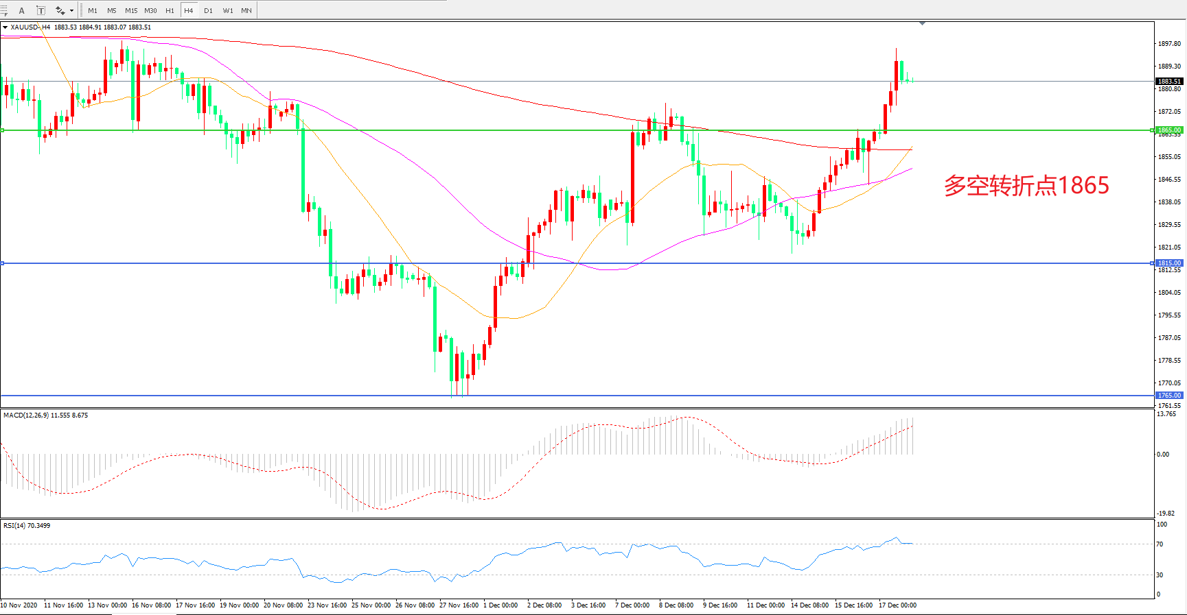 周四(12月17日),美国初请失业金人数意外不降反增,较上周环比增加2.3万,在失业数据打击下,美元指数两年半来首次跌穿90.00关口,现货黄金暴涨,直逼1900美元,收报1884.43美元/盎司。