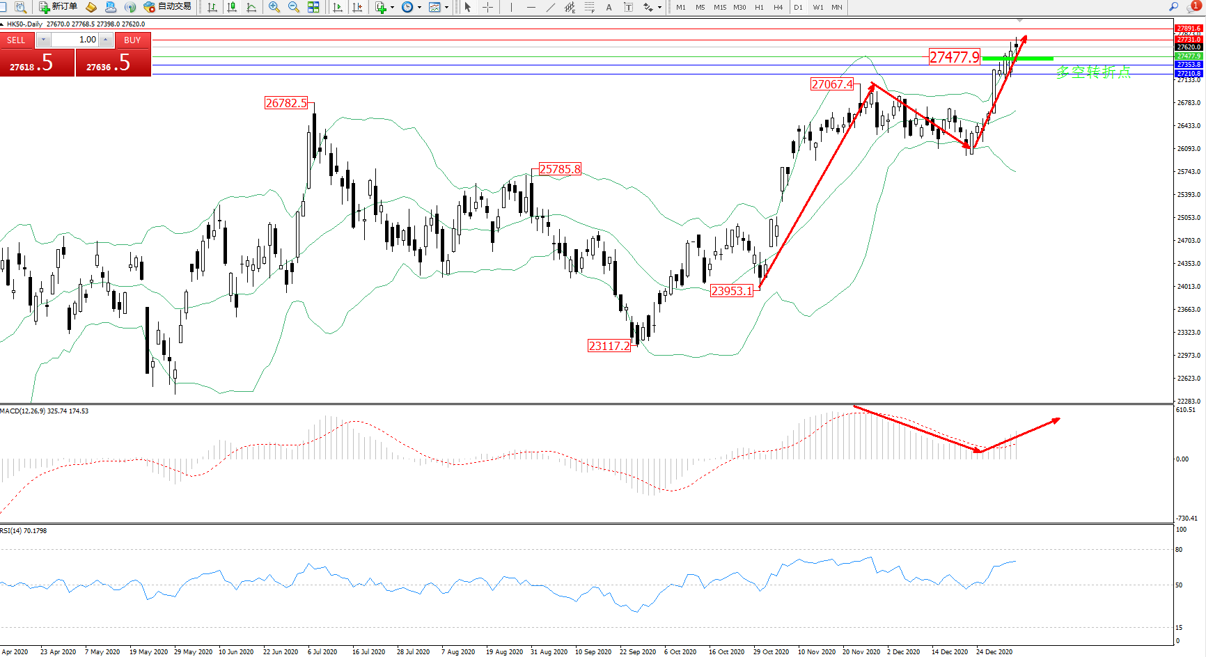香港恒生指数1月6日(周三)收盘上涨42.44点,涨幅0.15%,报27692.3点;港股探底回升,恒指走出V形态势,连续第6日上涨。恒生科技指数涨1.73%报8609点。香港本地股午后拉升,助力大市转涨;汽车经销商股跌幅最大,燃料电池、光伏股普跌,近日活跃的猪肉概念股全线回调。半导体股中芯国际尾盘一度冲高至20%。今日南下资金大幅净流入130.28亿港元,大市成交额为2181.22亿港元。香港期交所计划优化衍生产品市场的市场波动调节机制及开市前时段以保护市场持正操作。这些优化措施暂定于2021年第二季度推出。期交所计划加强市调机制,容许于每个交易时段可被多次触发。期交所计划在开市前时段及开市前分配时段设立随机停止机制,以防止竞价过程接近结束时可能出现的投机行为,并鼓励尽早输入买卖盘。为了促进随机停止机制,开市前时段将缩短一分钟同时开市前分配时段将延长一分钟。据央视,香港特区政府卫生署卫生防护中心1月5日下午介绍,截至当日0时,香港新增25例新冠肺炎确诊病例,包括本地感染病例22例,其中7例感染源头不明;累计确诊病例9074例。