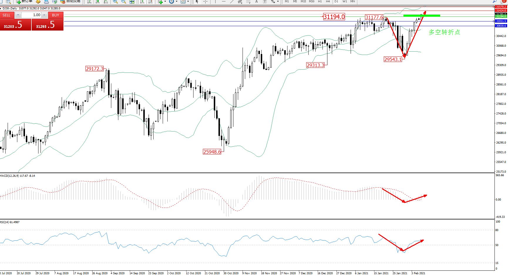 技术点评:高位空头动力维持震荡急速下行,跌破布林带指标下轨附近节点至29543位置后呈V型反转强势拉升,突破前期高位31177位置节点后有继续拉升上扬态势,布林带指标呈缓慢收口走势后有再度张口迹象,MACD指标低位多头动力弱势震荡回升至0轴线上方多头区域徘徊中,RSI指标处于50均衡线上方多头区域整理平缓上行中;