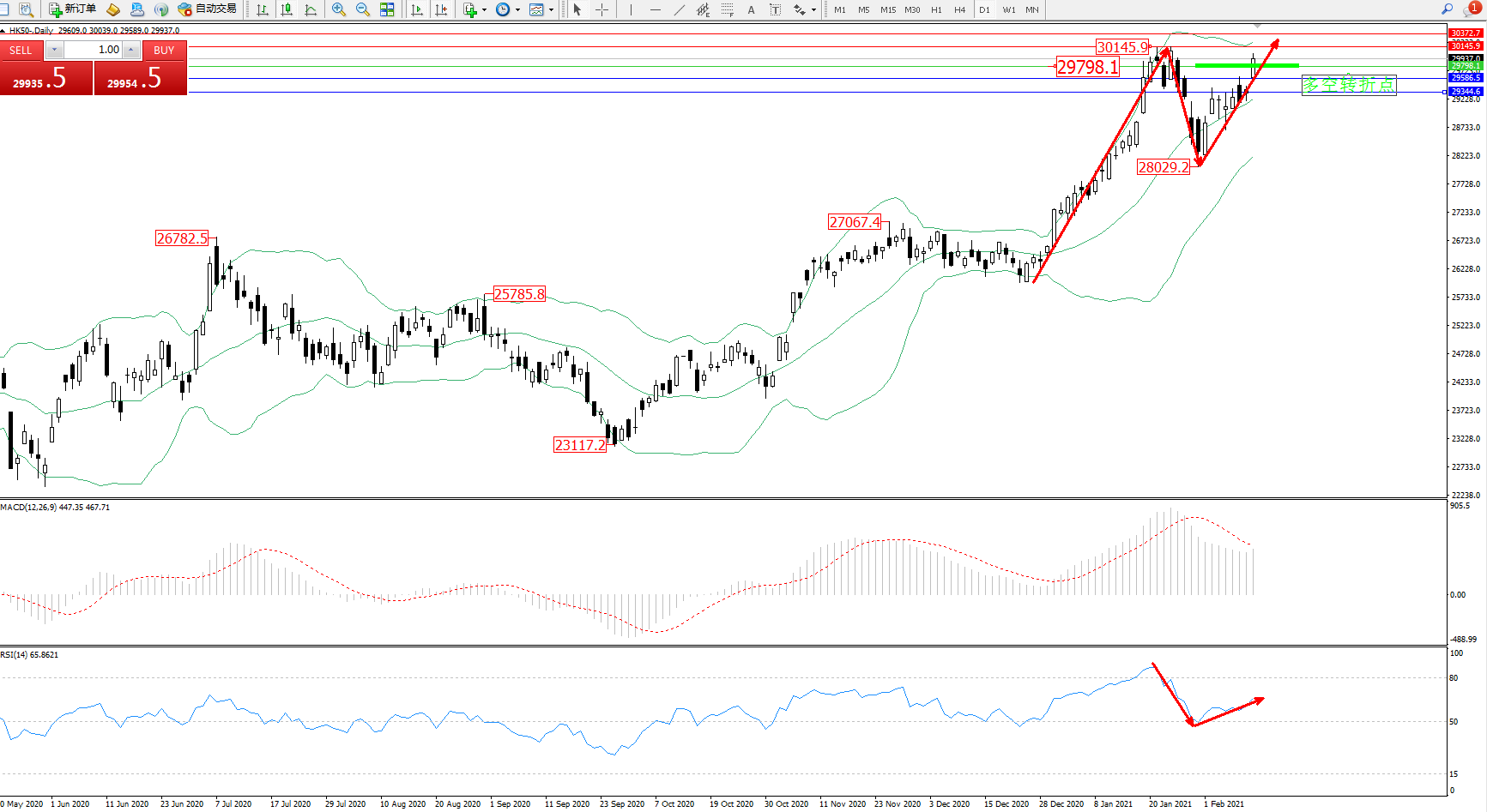 技术点评:多头动力高位短暂回撤后处于布林带指标通道中轨附近节点持续震荡向上移动中,前期高位30145位置近在咫尺,破位在即,布林带指标呈收口走势中,关注中上轨附近关键节点,多头动力有进一步向上移动态势,MACD指标处于多头区域高位维持整理缓慢下移,RSI指标处于50均衡线上方维持窄幅整理平缓上移中;
