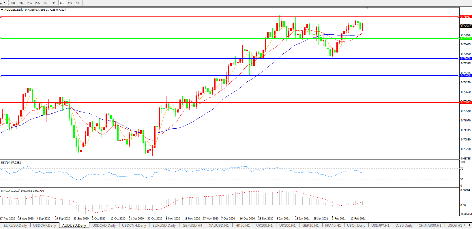 备选策略:0.7680下方看跌,目标0.7560、0.7460