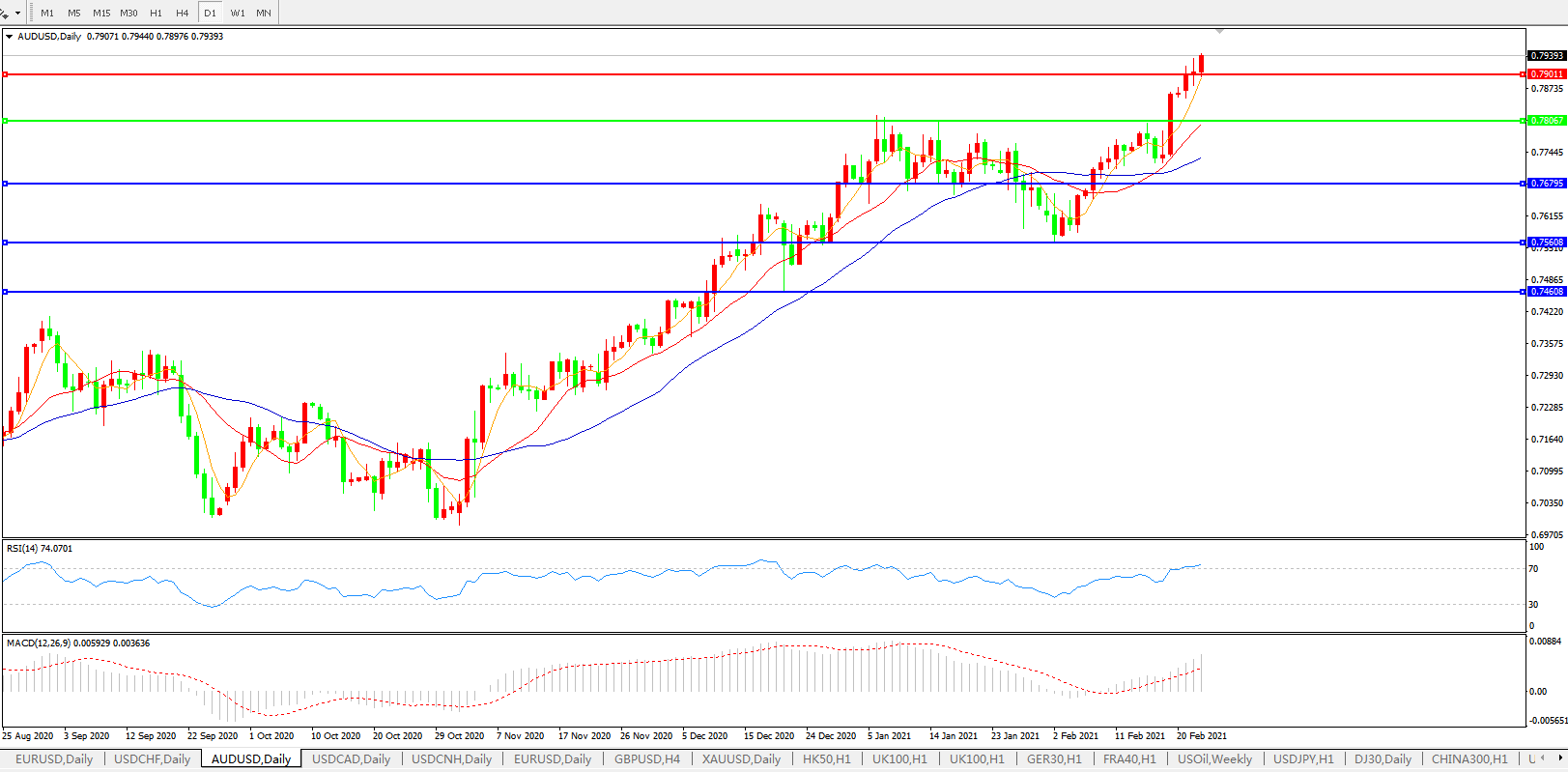 交易策略:0.7800上方看涨,目标0.7900、0.8000