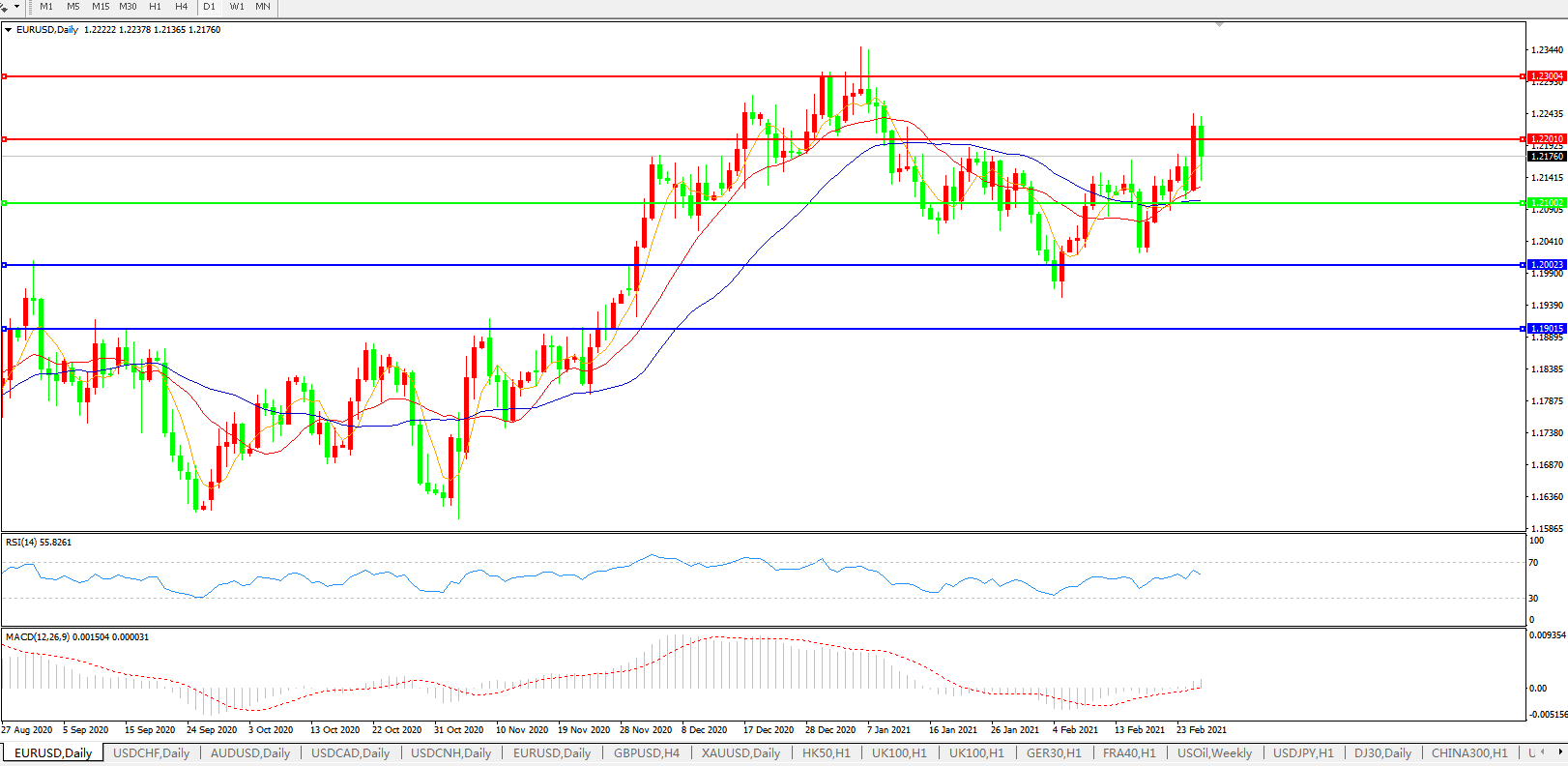 交易策略:1.2100上方看涨,目标1.2200、1.2300