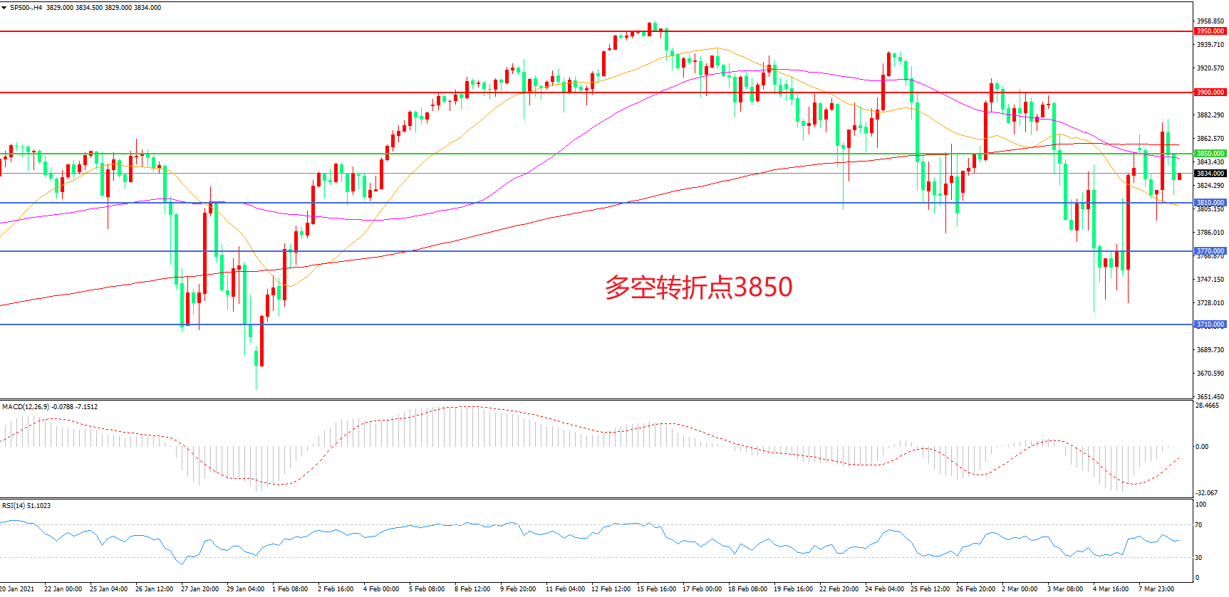 4小时图看,标普500长阳拉升后再度回来,短期走势陷入震荡,均线系统逐渐走平,3810成为短期支撑,    MACD绿柱缩短,RSI指标走平,日内延续震荡概率较大。