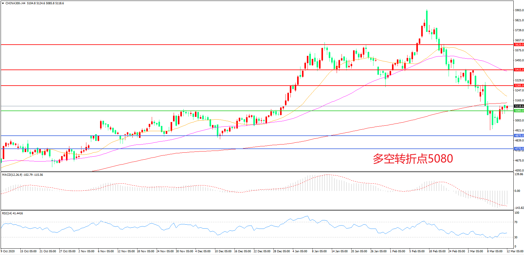 4小时图看,沪深300长阴下破后小幅回升,整体表现有所回暖,200周期成为多空分水岭,MACD绿柱缩短,RSI指标走平,日内延续震荡概率较大。