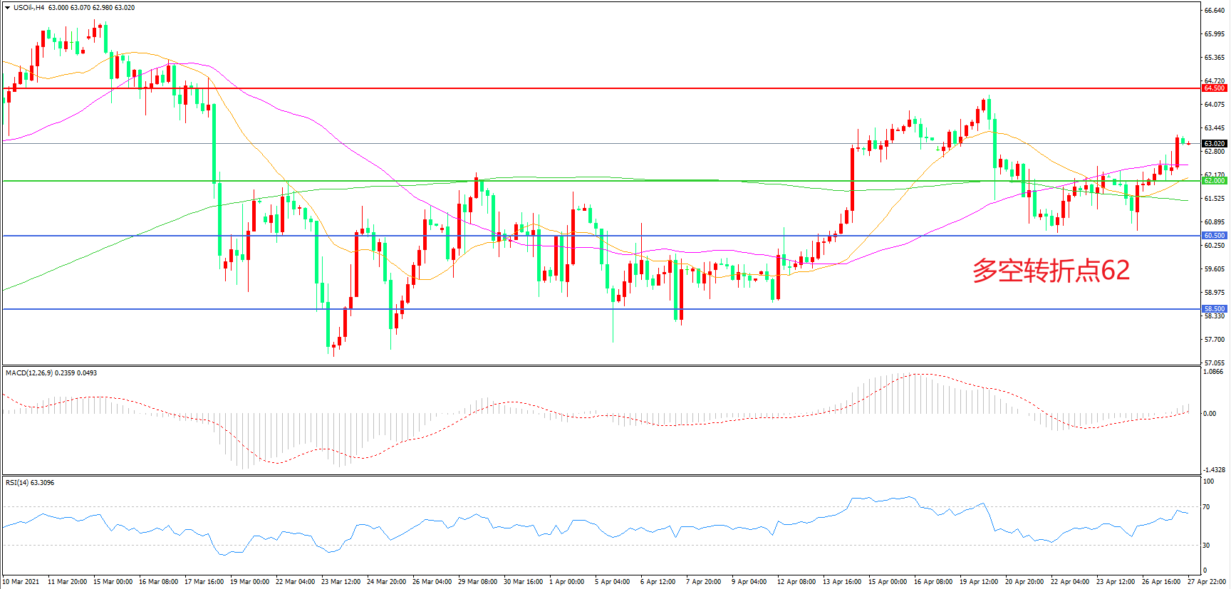 周二(4月27日),OPEC联合部长级监督委员会更多强调了“监控”市场状况,同时淡化了在7月之前突然改变增产政策的可能性,市场信心受到提振,美国WTI原油大幅上行,收报63.04美元/桶。接下来市场关注的重点将会放在今晚的EIA数据上,凌晨公布的API数据显示,美国原油库存增加了430万桶,大幅超出市场预期,因此油价是否还会继续向上冲击,则要看今晚22:30分公布的数据是否能够有更好的表现。