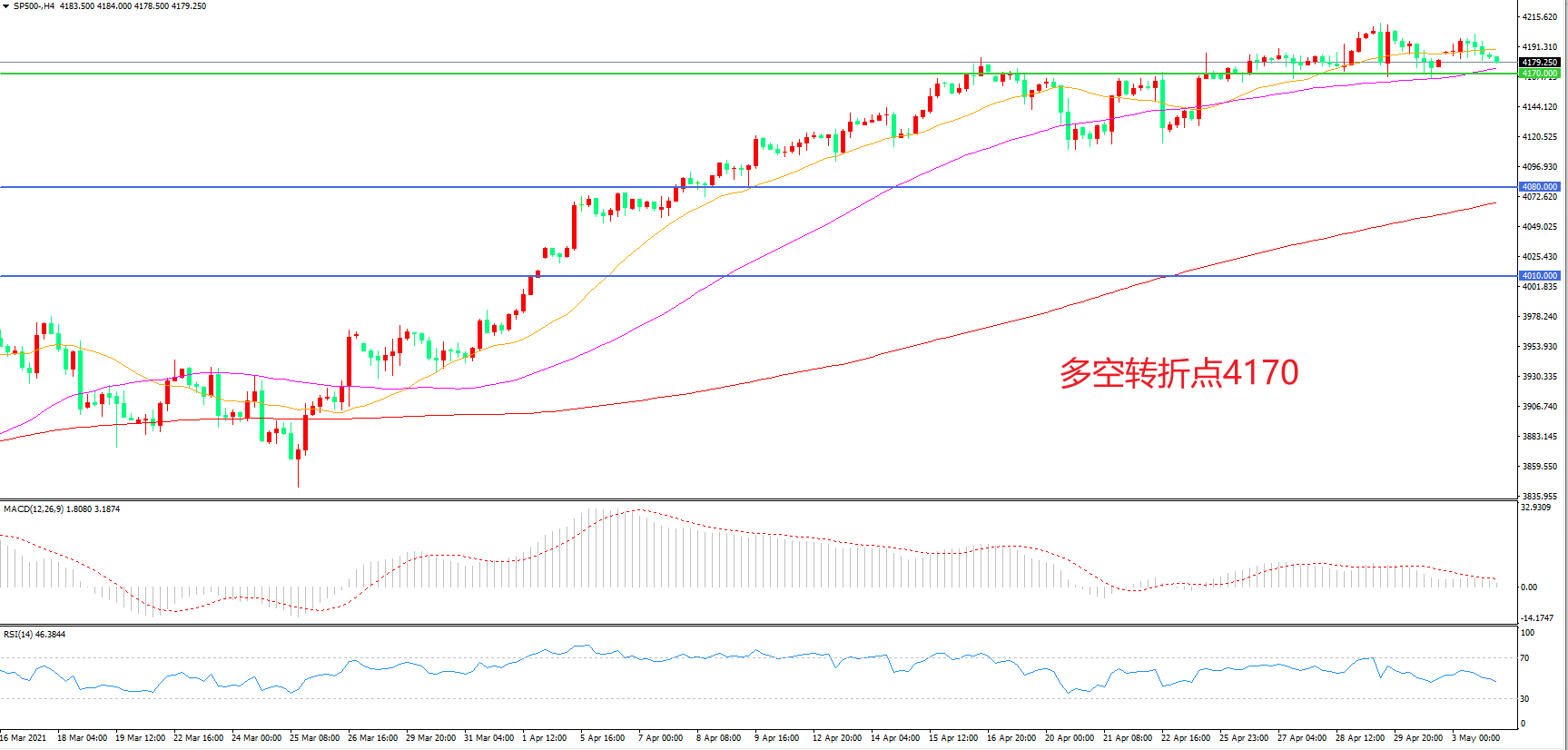 4小时图看,标普500突破4170后延续高位震荡,短线涨势有所放缓,但55周期均线的支撑依然稳固,4170成为多空分水岭,MACD红柱缩短,RSI指标走平,日内延续震荡概率较大。