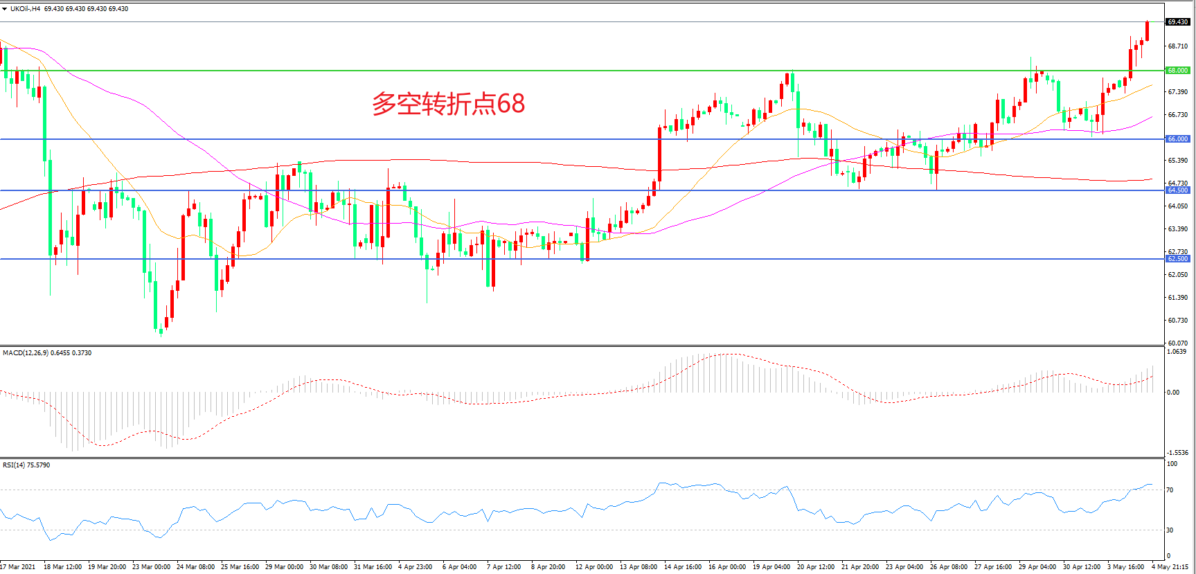 周二(5月4日),发达国家和主要新兴市场国家下半年需求强劲反弹的乐观情绪,盖过了印度全面封锁引发的担忧,各大投行轮番出场唱多油价为多头提供了良好的外部环境,美国布伦特原油大幅上行后,收报69.43美元/桶。随着夏季需求旺季的来临,加上美国、英国和欧洲部分地区正在重新开放,原油需求也迎来了爆发的希望。
