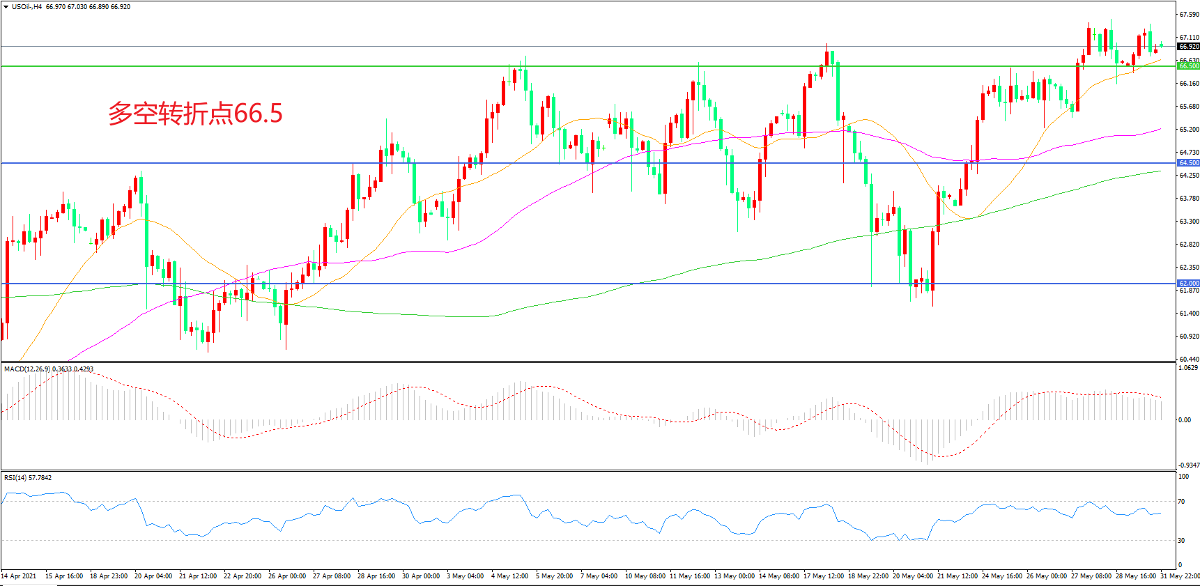 周一(5月31日),由于国和英国市场周一因公共假期而休市,市场交投较为清淡,所以市场波动幅度相对有限,美国WTI原油延续窄幅震荡,收报66.94美元/桶。在阵亡将士纪念日长周末假期前夕,美国汽油库存下降而消费上升,预示夏季驾驶季和燃料需求高峰开始,全球石油需求正在积极复苏