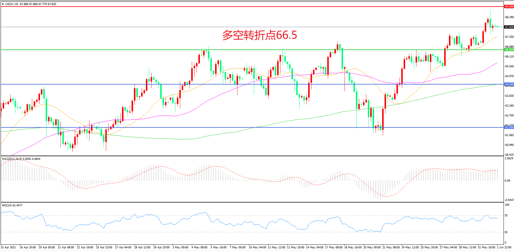 4小时图看,油价强势突破前期整理区间,整体表现十分强势,69美元成为中期阻力,66.5成为下方支撑,MACD红柱增加,RSI指标向上,日内震荡上行概率较大。
