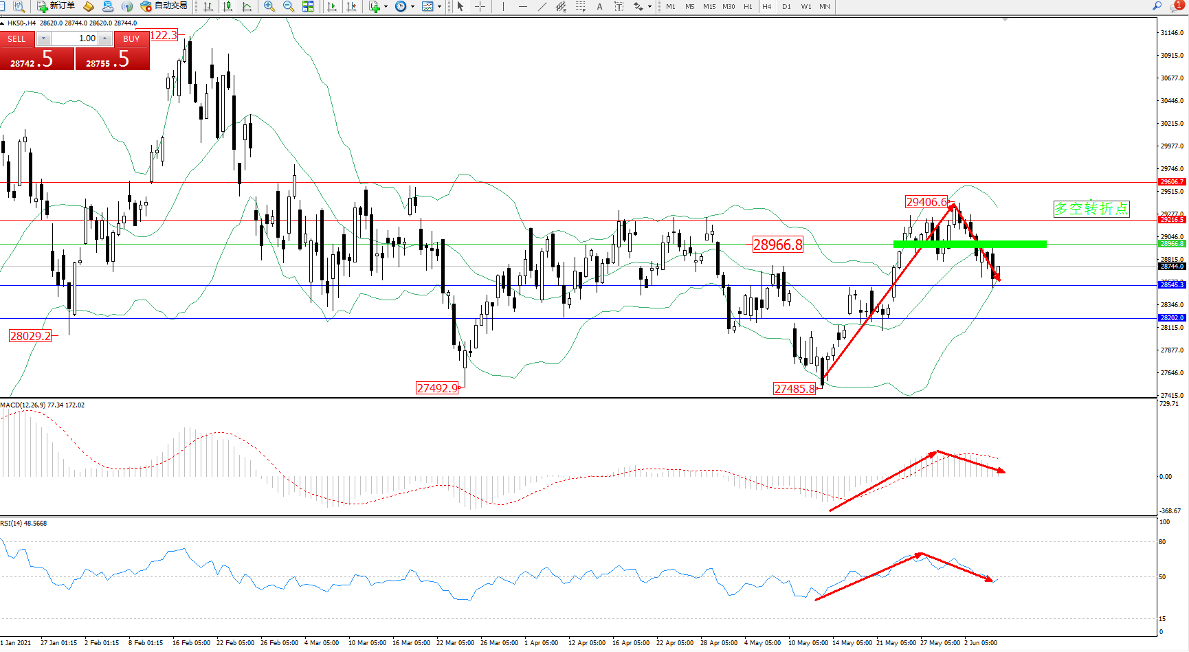 技术点评:低位多头动力持续震荡上扬至布林带指标上轨29406附近遇阻整理,短期徘徊后空头动力伺机入场反转下行,触及布林带指标下轨附近节点后得到短暂支撑小幅上移,布林带指标呈收口走势持续中,关注中轨附近节点,短期空头或有进一步调整下行迹象,MACD指标处于0轴线上方多头区域维持整理向下移动,RSI指标处于多头区域维持窄幅震荡后跌破50均衡线进入空头动力弱势徘徊;