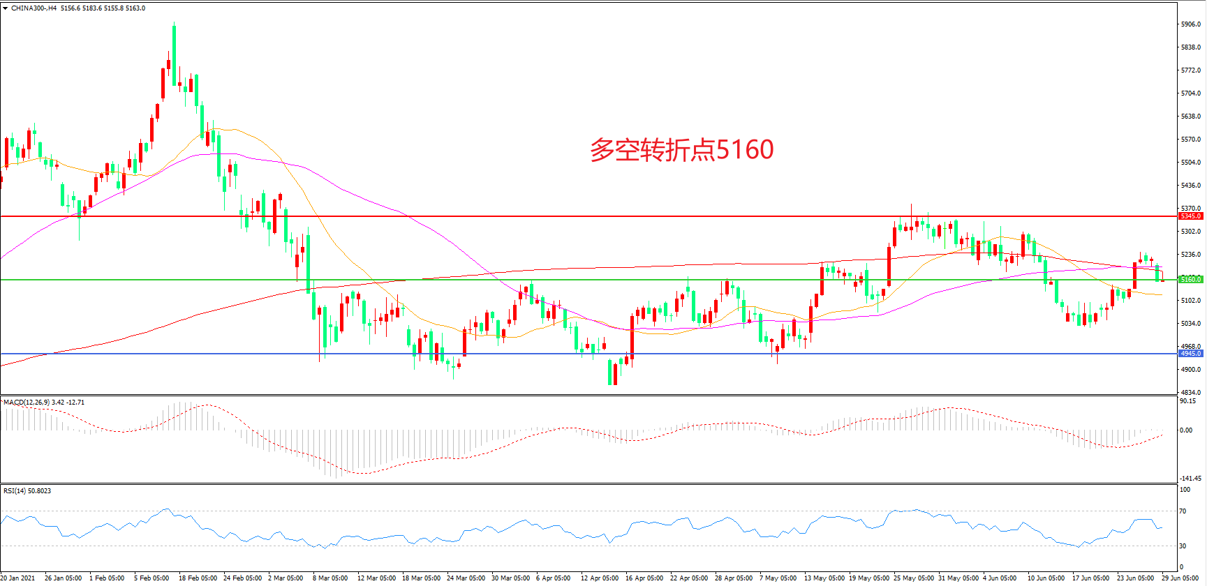 4小时图看,沪深300高位震荡后中阴下破,上行趋势暂缓,均线系统支撑被跌破,5160成为多空分水岭,MACD绿柱缩短,RSI指标走平,日内延续震荡概率较大。