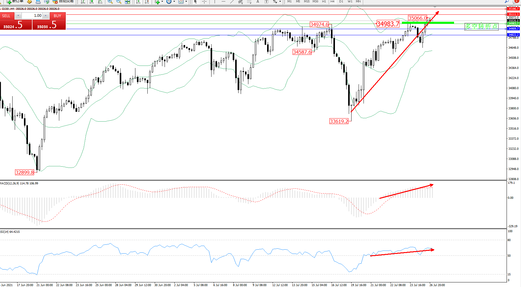 道琼斯指数DJ30——4小时K线图显示:
