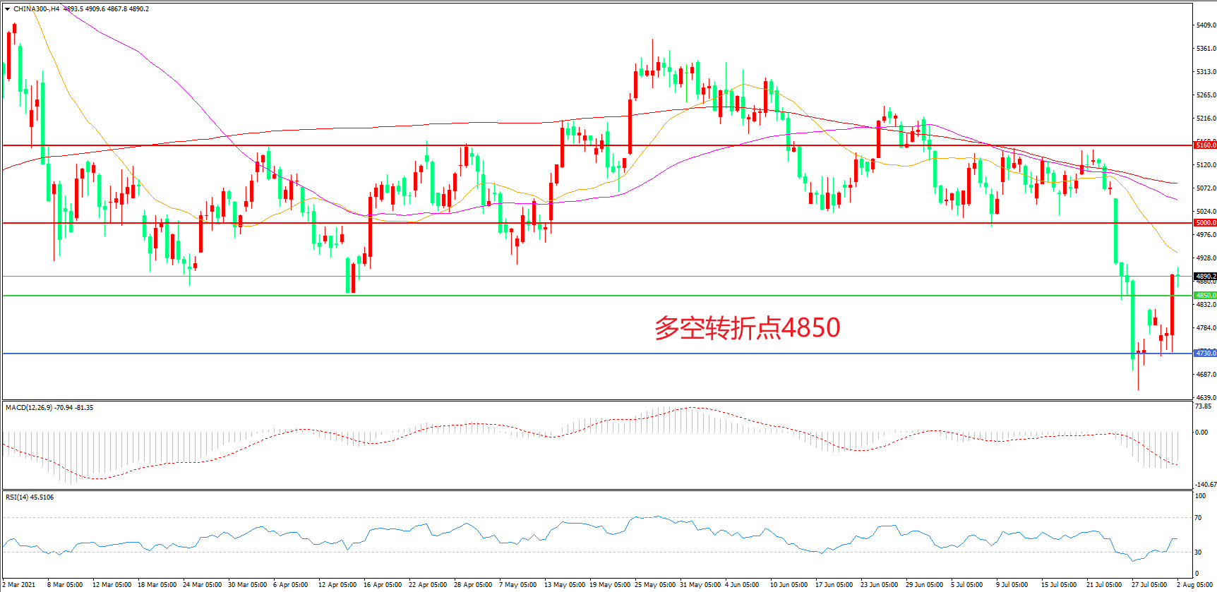 4小时图看,沪深300连续试探4730支撑后大幅拉升,短线行情有所回暖,4850一线被顺利突破,5000点成为上方阻力,MACD绿柱减少,RSI指标向上,日内震荡上行概率较大。