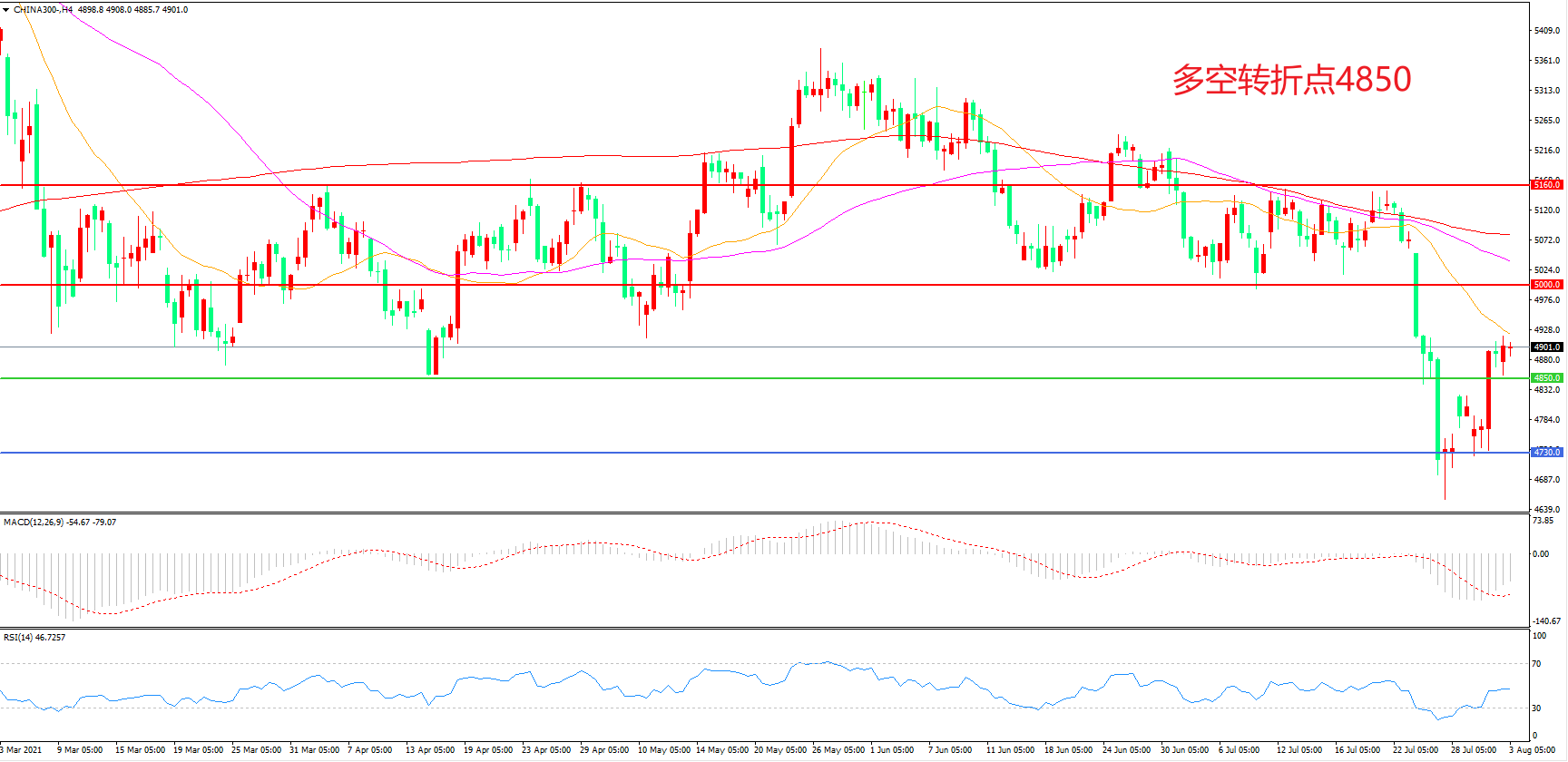 4小时图看,沪深300大幅拉升后延续震荡,短线行情有所回暖,4850成为短线多空分水岭,5000点成为上方阻力,MACD绿柱减少,RSI指标走平,日内震荡上行概率较大。