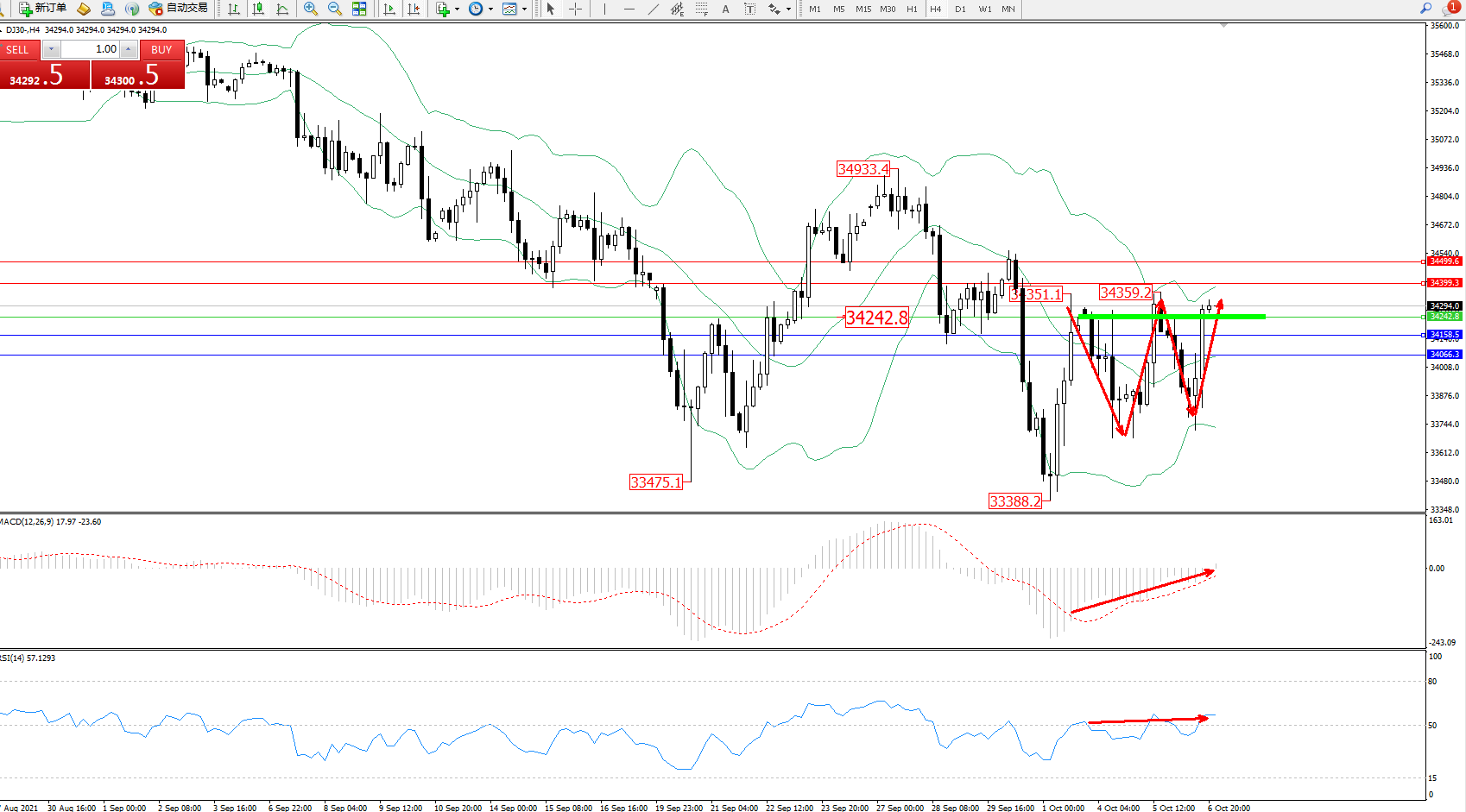 道琼斯指数10月6日(周三)收盘上涨103.11点,涨幅0.30%,报34417.78点;美股低开高走,三大股指全线收涨,美国参议院共和党领袖麦康奈尔向民主党提议短暂提高债务上限至进入12月,这将缓解迫在眉睫的违约风险,同时也可能让这个问题卷入两党年末的政治大战;参议院多数党领袖舒默尚未做出公开回应,但他已召集参议院民主党人会谈,料将与麦康奈尔交换意见。麦康奈尔提议把联邦债务上限提高一个固定的美元金额,足够财政部应付到12月,届时国会需要再度投票表决以避免联邦债务违约。