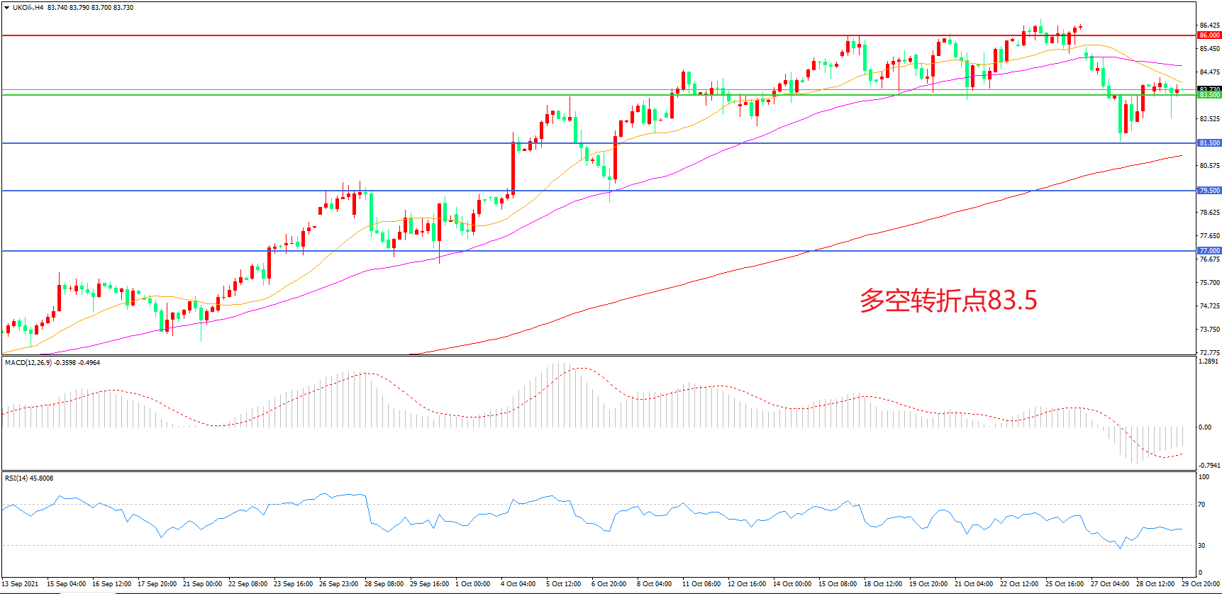 4小时图看,油价低位调整后再度拉升,整体表现偏强,83.5成为多空分水岭,86成为上方阻力,MACD绿柱缩短,RSI指标走平,日内延续震荡概率较大。