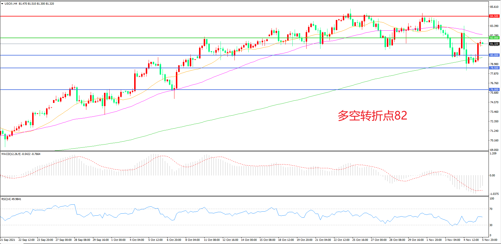 4小时图看,油价回踩200周期均线后再度拉升,短线走势有所回暖,82成为短期阻力,80美元成为下方支撑,MACD绿柱缩短,RSI指标走平,日内弱势震荡概率较大。
