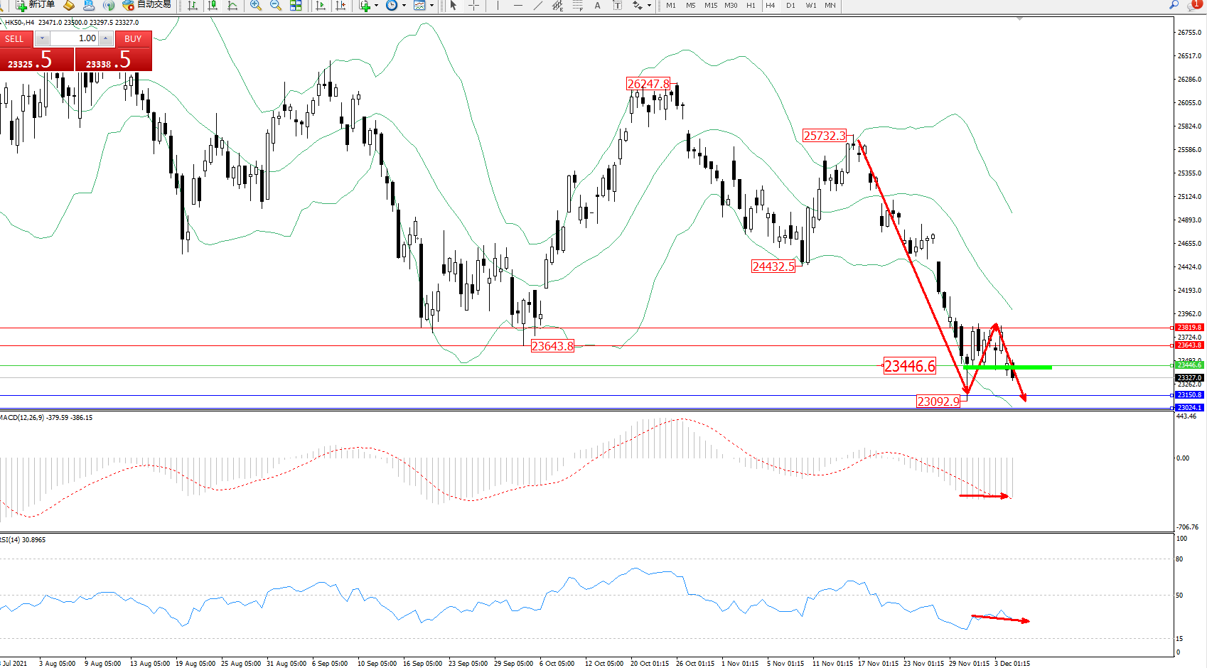 技术点评:空头动力延续布林带指标下轨附近持续震荡下行,低位抵达23092位置得到支撑反转上移,短期多头动力伺机入场,但整体市场下行趋势态势良好,空头动力再度向下移动,跌势延续,布林带指标呈收口走势持续向下移动中,MACD指标处于空头区域维持整理平移,RSI指标处于空头区域冲冲喜震荡中;