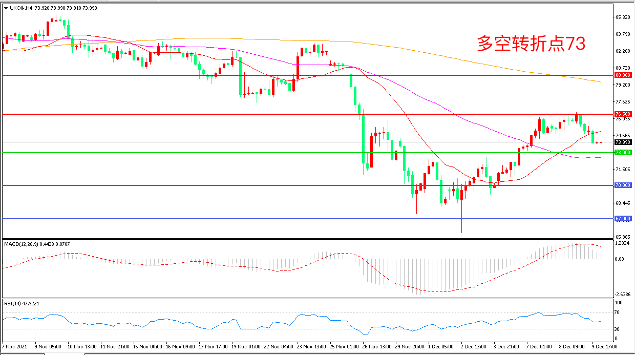 4小时图看,油价触碰76.5美元阻力后震荡回落,上行趋势暂缓,均线系统走平。73美元成为多空分水岭,MACD红柱缩短,RSI指标走平,日内延续震荡概率较大。