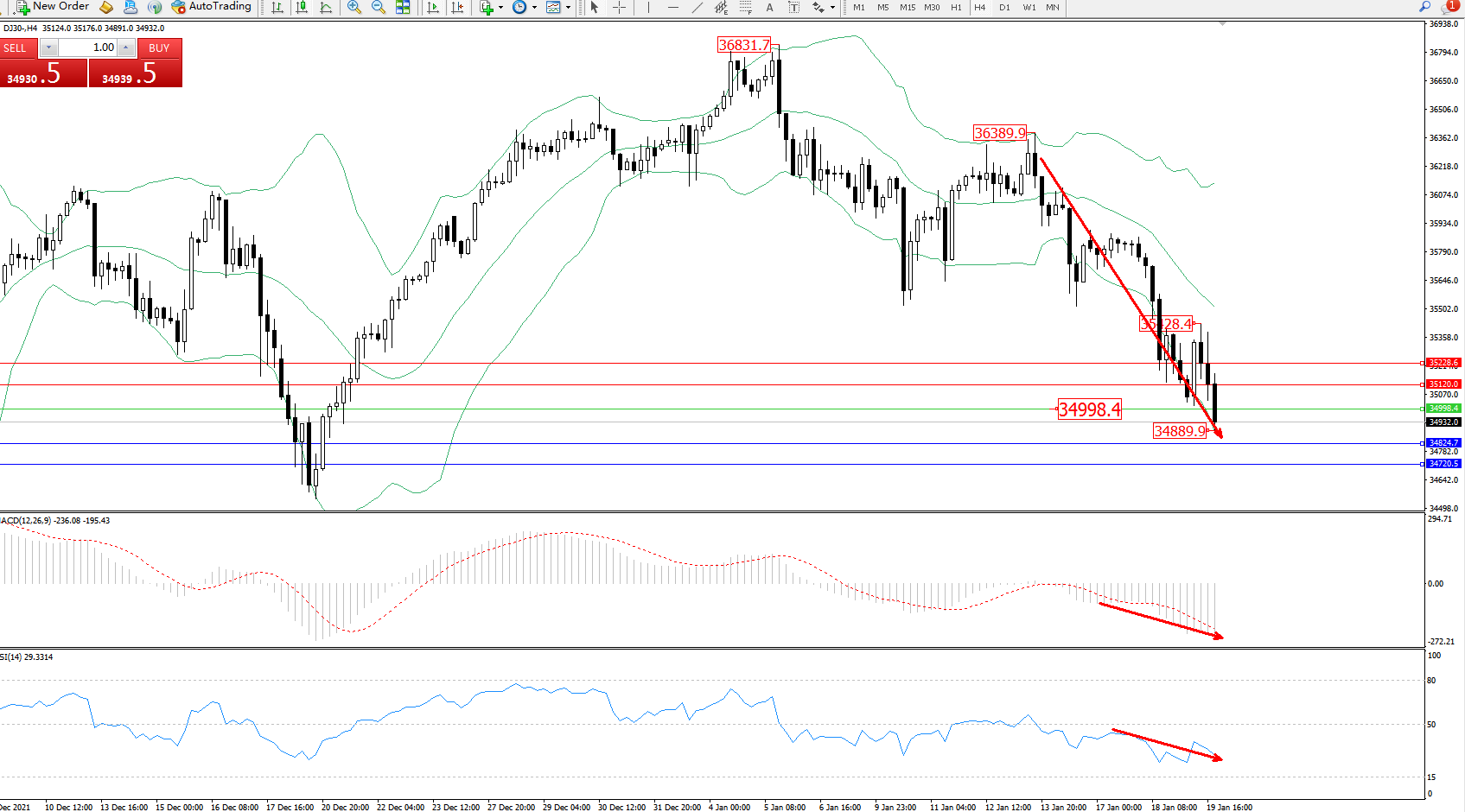 道琼斯指数1月19日(周三)收盘下跌339.62点,跌幅0.96%,报35028.85点;交易员在等待美联储1月25-26日的会议,预计美联储将为缓解有增无减的通胀压力上释放更积极的信号。目前美国通胀水平处于近40年高位。由于新冠疫情大流行导致供应链混乱,导致生活成本高昂,这对总统拜登来说是一场政治噩梦,他的支持率受到了打击。美联储将被迫在3月开始加息,年内可能加息四次。
