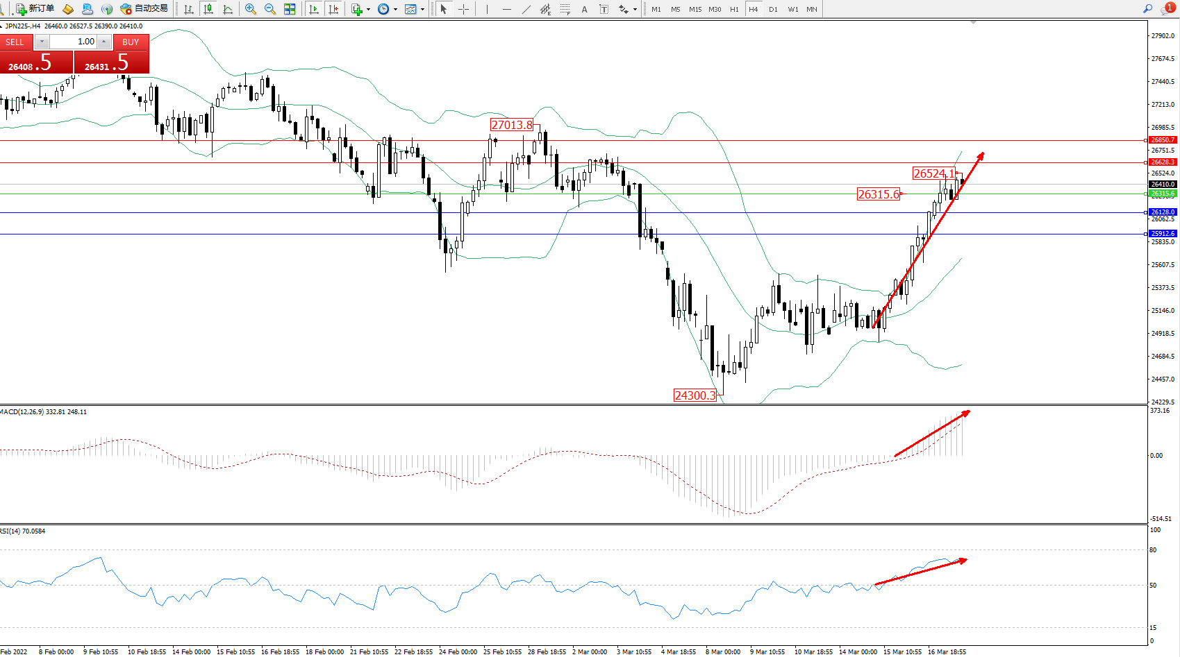 日经225指数3月17日(周四)收盘上涨881.99点,涨幅3.42%,报26644.00点。美联储四年来首次加息25基点后,美国国债收益率飙升,10期美债收益率上涨约4个基点至2.18%,2年期美债收益率跃升8个基点至1.93%。与之相比较的是,市场预期本周五日本央行将还是维持利率不变。利差的进一步拉大,显然继续拉动外汇市场上的套利交易,继续打压着日元,美元兑日元隔夜市场上一度上涨至119.12,为2016年2月以来的最高水位,而日元也是出现连续第八天下跌,持续下跌市场是逾五年来最长的。