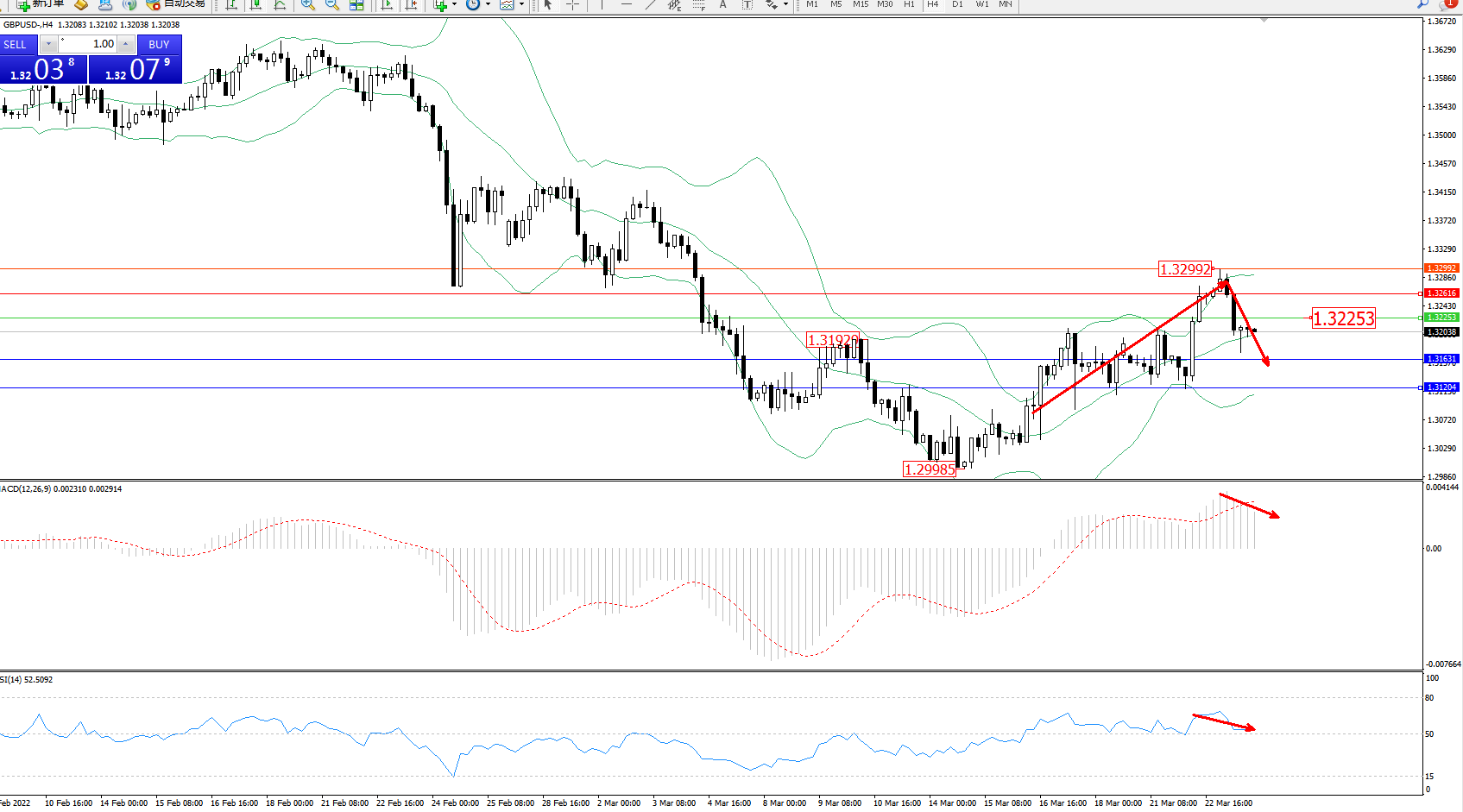 交易策略:1.32253下方看跌,目标1.31631、1.31204