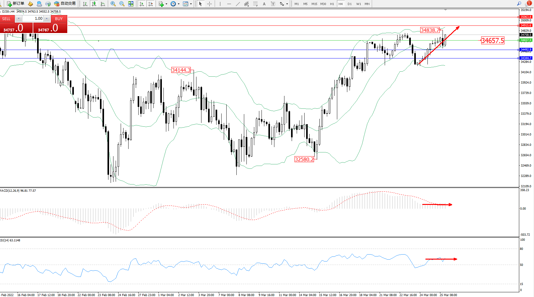 道琼斯指数3月25日(周五)收盘上涨153.70点,涨幅0.44%,报34861.64点;美股三大股指涨跌不一,道指 震荡上移,美国股市周五走势震荡,临近收盘时涌现的逢低买盘推动大盘收涨。美国国债下跌,收益率曲线短端首当其冲。随着投资者忙于应对货币政策紧缩和俄乌战争给经济复苏带来的风险,美元指数基本持稳,本周涨0.56%,为过去七周来的第六次周线上涨。美元受益于其作为避风资产的地位,且乌克兰冲突推动了人们对美联储将加息的预期。