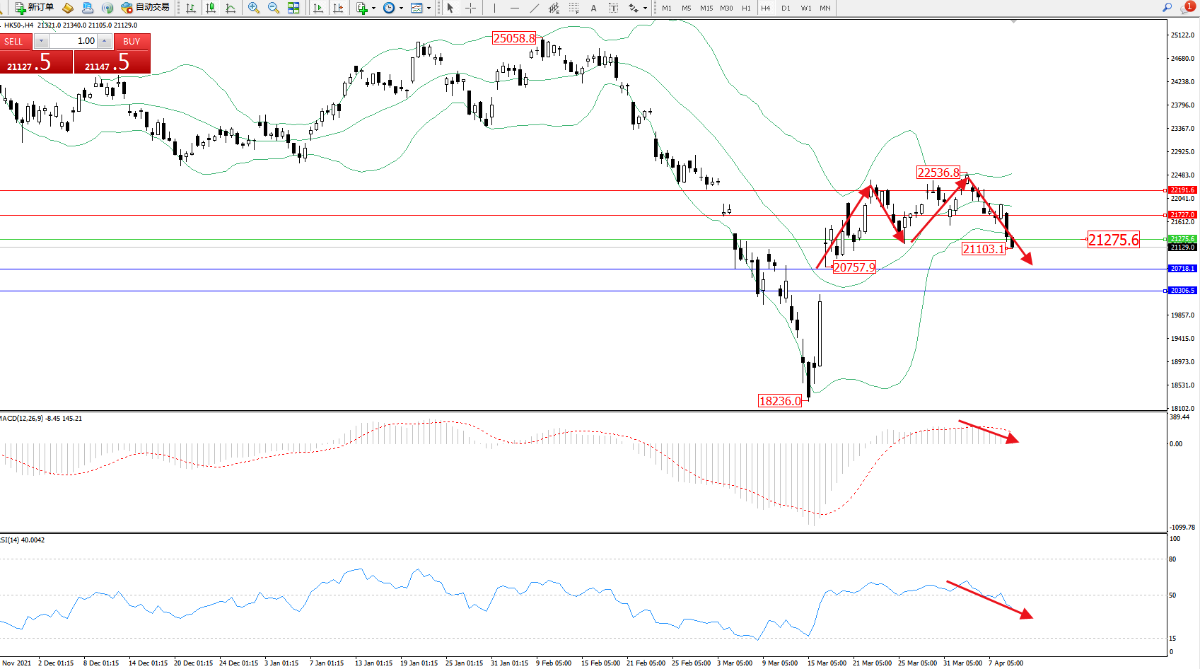 香港恒生指数4月11日(周一)收盘下跌663.71点,跌幅3.03%,报21208.3点;港股指数全天呈单边下跌行情,热门行业板块全挫,科技股再度大跌,致恒生科技指数跌5.24%再度失守4200点,快手、小米跌超6%,百度、阿里巴巴、美团跌超5%,腾讯跌超4%;餐饮股、汽车股全线大跌,疫情导致产能受限,大型金融股等纷纷下跌。惟香港银行股少数飘红,新锐医药尾盘大幅拉升收涨近62%,为市场表现最佳。南下资金逆势净流入13.12亿港元,大市成交额为1222亿港元。美国10年期债息的上扬,以及担忧内地疫情加剧供应链问题,港A两地股市集体重挫。10年期美国国债收益率一度升至2.784%,创2019年1月以来新高。国内上海疫情仍旧严峻,广州疫情防控升级。