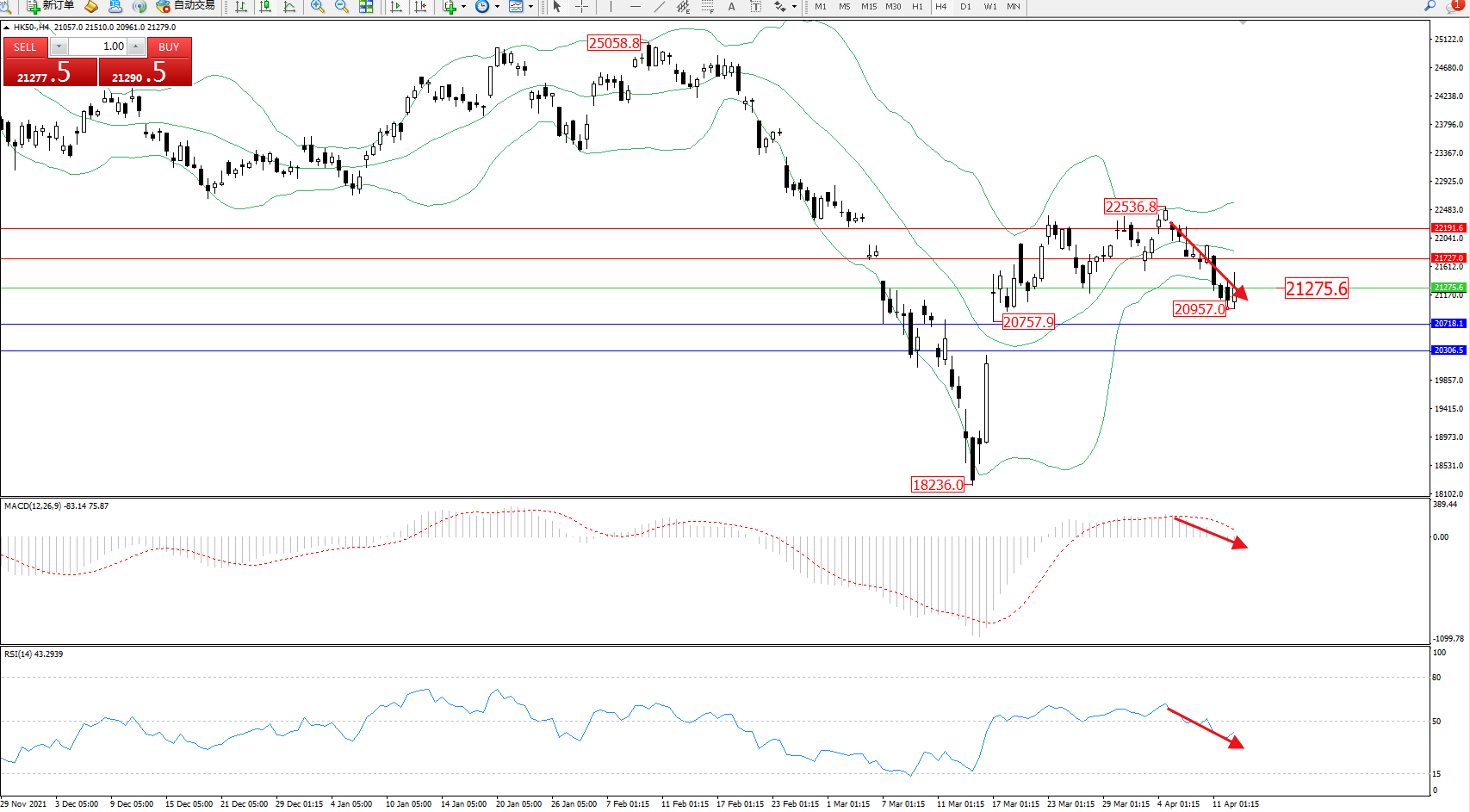 香港恒生指数4月12日(周二)收盘上涨110.83点,涨幅0.52%,报21319.13点;港股午后拉升回暖,三大指数皆由跌转升。恒生科技指数涨1.4%,止步4连跌。大型科技股反弹,美团、网易、京东涨超4%,腾讯涨3.6%,市场人士预期,货币政策有望迎来一些积极信号。当前,市场对于降息和降准都有期待。另一方面,俄乌局势再有新进展。