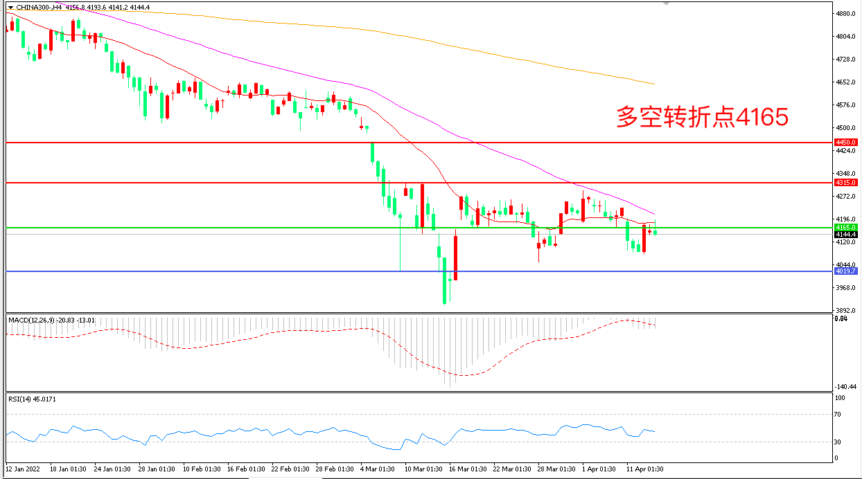 周三(4月13日),A股三大股指重回调整格局,医药、新能源、基建等权重板块下挫,沪深300小幅回落,收报4144.4点。两市成交约8734亿元,北向资金净卖出4.09亿。中期看,国内新冠疫情形势依然严峻,经济面临的的下行压力依然较大,市场仍有可能较长一段时间维持震荡磨底走势。