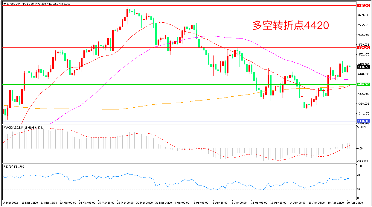 周三(4月20日),根据美联储公布的褐皮书显示2月中旬以来经济温和扩张,地缘政治和通胀影响经济前景,标普500小幅反弹,收报4467.75点。今日,美联储主席鲍威尔和欧洲央行行长拉加德将就全球经济发表讲话,欧美央行在货币政策上的分歧可能导致市场大幅波动,务必重点关注。