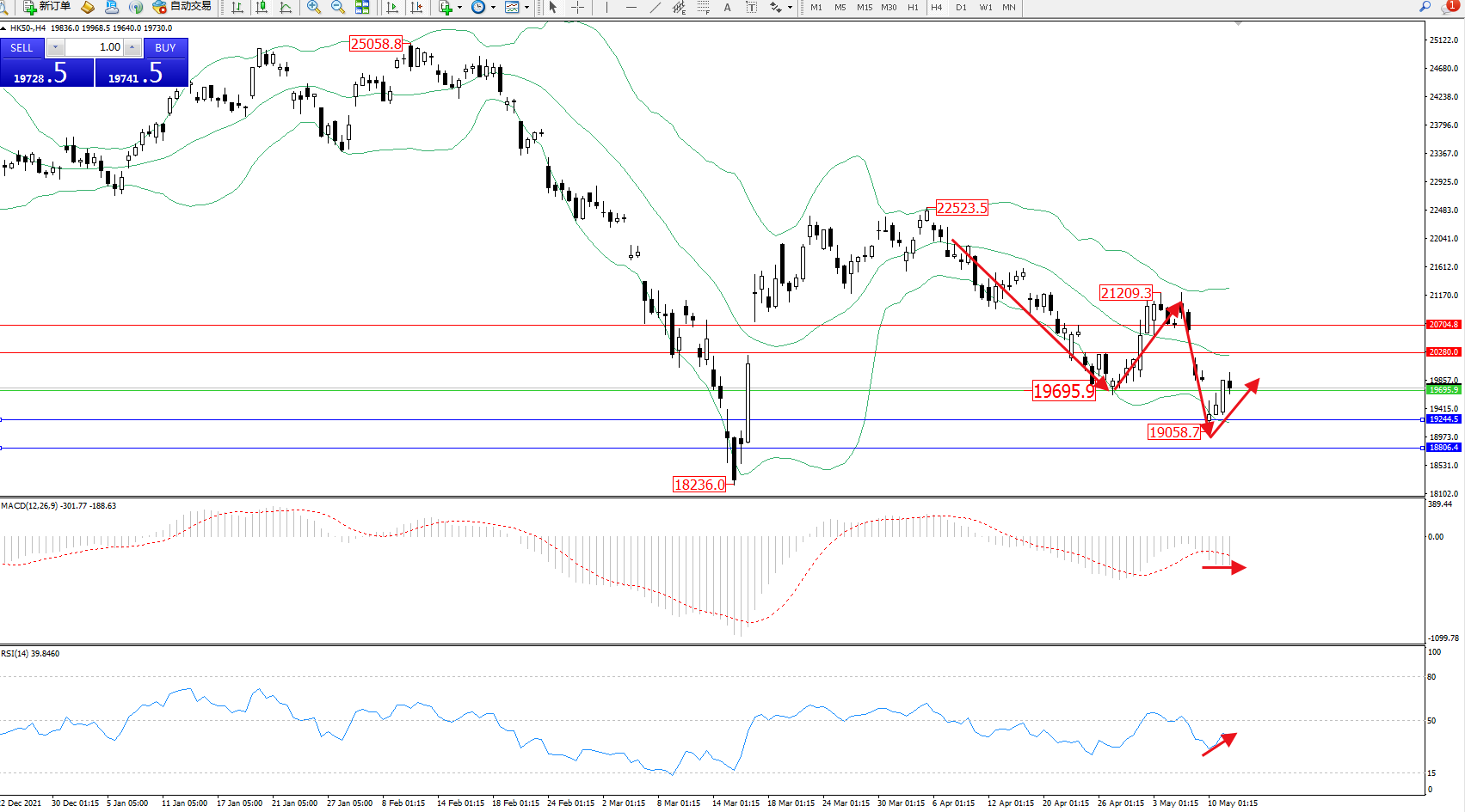 技术点评:空头动力延续布林带指标通道持续震荡下行,低位抵达19058附近节点后反转震荡上移,短期低位多头动力有伺机入场迹象,布林带指标呈张口走势后开始有收口迹象,MACD指标处于0轴线下方空头区域维持整理平移,RSI指标处于空头区域维持震荡缓慢上移;