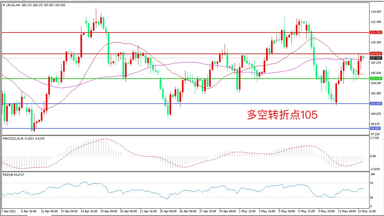 周四(5月12日),欧洲局势再度陷入紧张!俄罗斯外交部生产若芬兰和瑞典加入北约,俄将不得不采取手段消除可能的威胁,布伦特原油延续强势表现,收报107.91美元/桶。短期看,油价仍处在多空因素交织的氛围下,因自身暂时并没有很强的下行驱动,而地缘因素及供应忧虑可能随时刺激市场,这让油价暂时难以摆脱高位区间震荡走势,投资者注意谨慎追高。