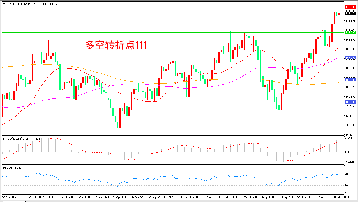 周一(5月16日),有消息称欧盟接近达成禁运俄油协议,如果最终该消息落地将在进一步引发供应端紧张和全球“抢油”大战,美国WTI原油再度飙升,收报113.92美元/桶。中期看供应紧张仍是市场主旋律,投资者会继续在地缘因素主导的能源危机与宏观层面压力之间的博弈,油价延续强势概率较大。