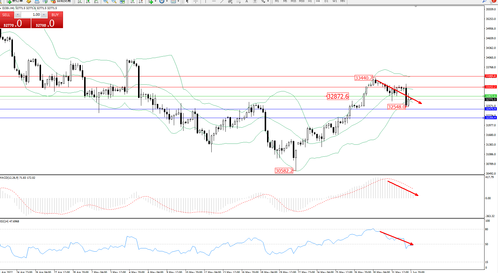 技术点评:高位维持弱势整理缓慢下挫,跌破布林带指标下轨至32548附近节点后开始震荡,短期空头动力有继续震荡回撤下行走势迹象,布林带指标呈收口走势持续中,MACD指标处于多头区域维持震荡缓慢下挫,RSI指标空头动力维持震荡下行至50均衡线下侧徘徊中;