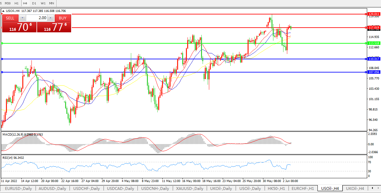 4小时图看,油价再度拉升至均线上方,短线走势回归强势, MACD动能柱逐步伸长,RSI指标回暖,日内延续整理概率较大。