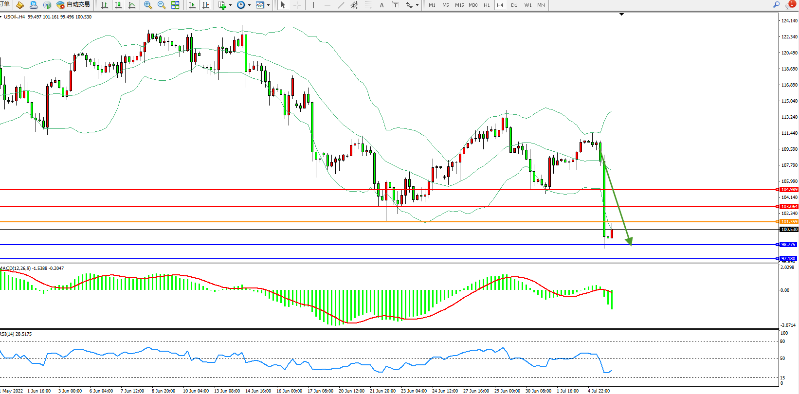原油急速下行至100.631附近震荡,随着对俄制裁导致国内油价飙升,欧美国家近期纷纷施压OPEC提高产量。就在美国总统拜登上周话音刚落不久,英国首相鲍里斯·约翰逊本周也敦促沙特增加石油产量,试图为创纪录的燃油价格降温。