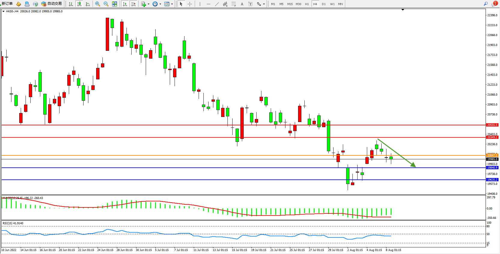 香港恒生指数8月8日(周一)收盘下跌156.17点,跌幅0.77%,报20045.77点;港股全天维持下跌行情,市场情绪低落,大市成交额缩量至749亿港元。恒生科技指数跌1.17%及1.82%。大型科技股疲弱拖累大市走低,阿里巴巴跌4.4%,小米、京东跌超3%,腾讯、美团、快手均跌超2%,香港交易及结算所有限公司(香港交易所)今天(星期一)欢迎首批A股结构性产品—MSCI中国A50互联互通指数衍生权证上市,进一步巩固香港作为离岸A股风险管理中心的地位。