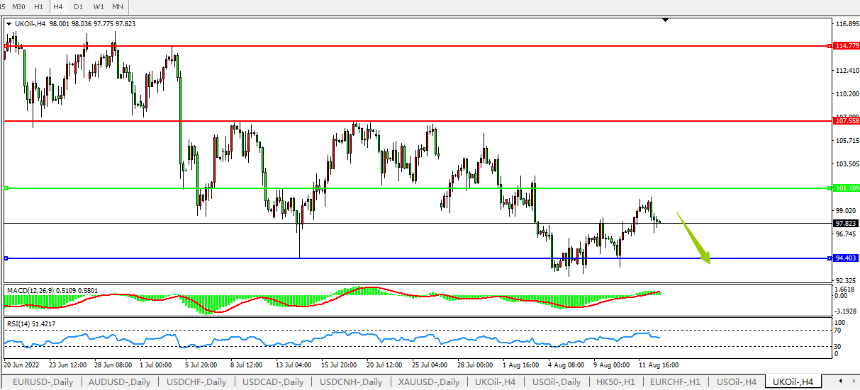 4小时图看:短线价格持续弱势下行,中期图形结构转空头,适合逢高滚动沽空, MACD量能柱0轴上小幅缩量,RSI小幅走弱,短期油价继续下行概率较大。