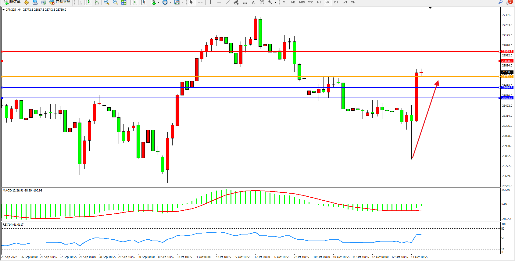 日经225指数10月13日(周四)收盘下跌148.33点,跌幅0.56%,报26248.50点。日本央行季度调查显示,预计未来一年物价将上涨的日本家庭比率从6月调查的87.1%降至85.7%。