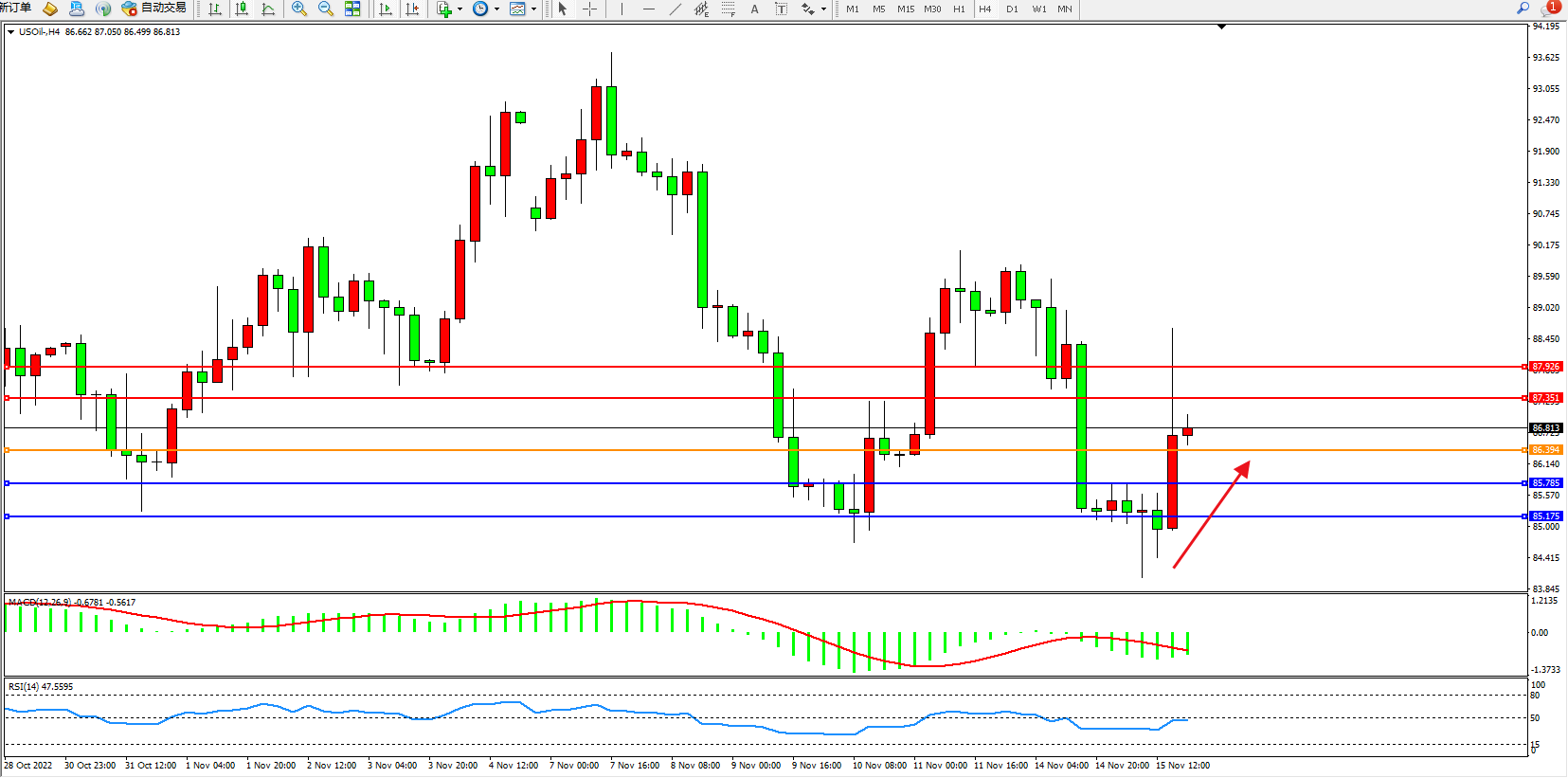 4小时图看:低位多头急速拉升,短期看涨情绪开始涌现,市场多头动力不断强势入场,MACD指标处于空头区域整理上移,RSI指标处于50均衡线下侧弱势徘徊;