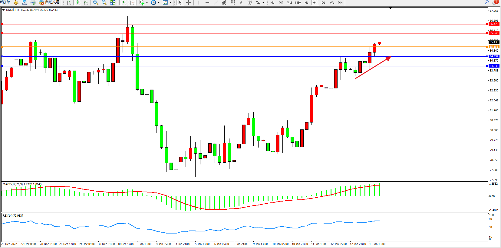 4小时图看:高位短期持续看涨,市场多头情绪笼罩,短期未见有止步迹象,MACD指标处于多头区域高位徘徊,RSI指标处于多头区域高位整理;